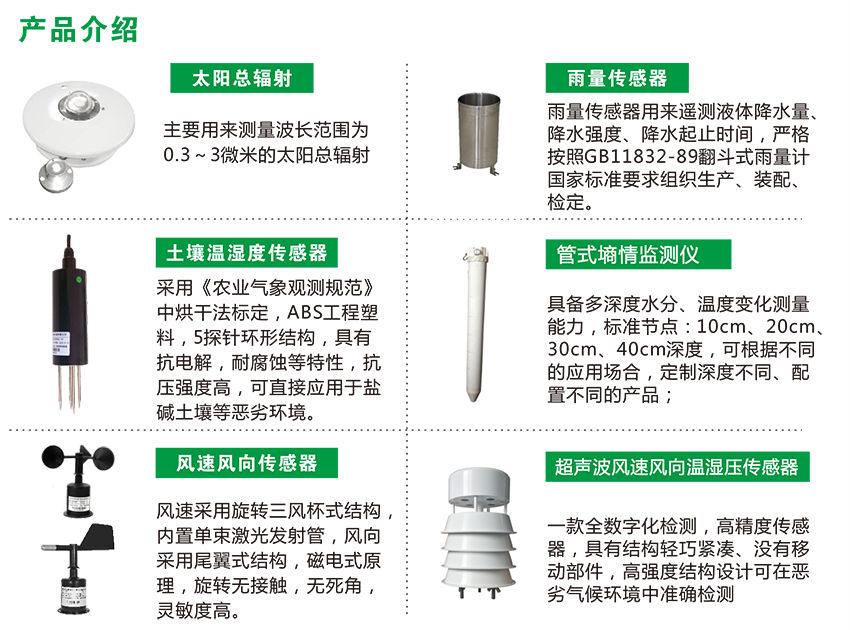 物联网大田环境监测系统主要分为农田气候监测站和土壤墒情监测站,农田气候监测站主要由传感器(风速风向、空气温湿压、雨量、雨雪、蒸发、光照度、太阳总辐射、光合有效辐射