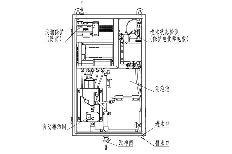 在线浊度监测单元(含流通消泡缸、测量缸、传感器、排污阀、选配温控加热防冻模块等) | 1 | 机柜内部 |