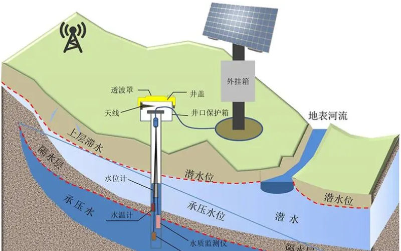 一体化地下水自动监测站选用一体化设计,设备本身完全不受潮湿或外部电流的影响,可实现对所在监测区域的水位、水温等参数的实时监测和数据定时上报或中心召测的功能。监测数